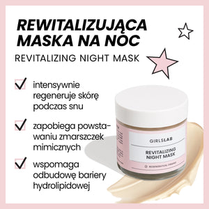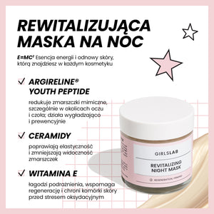 Obudź w skórze naturalne GLOW! Rewitalizująca maska nocna intensywnie regeneruje skórę podczas snu, zapewniając jej wygładzenie, elastyczność i zdrowy wygląd. E=MC2 - eliksir bogaty w antyoksydanty - dodaje energii i naturalnego blasku. Argireline® YOUth zapobiega powstawaniu zmarszczek mimicznych, a CeraFluid® wspomaga odbudowę bariery hydrolipidowej.