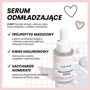 Zachowaj młody wygląd na dłużej! Odmładzające serum z trójpeptydem miedziowym (GHK-Cu) wygładza skórę, poprawia jej elastyczność i zmniejsza widoczność zmarszczek. Kompleks E=MC2  wspiera regenerację i przenikanie składników aktywnych w głąb skóry. Kwas hialuronowy w dwóch formach pozostawia skórę nawilżoną i ujędrnioną - pełną młodzieńczego blasku.